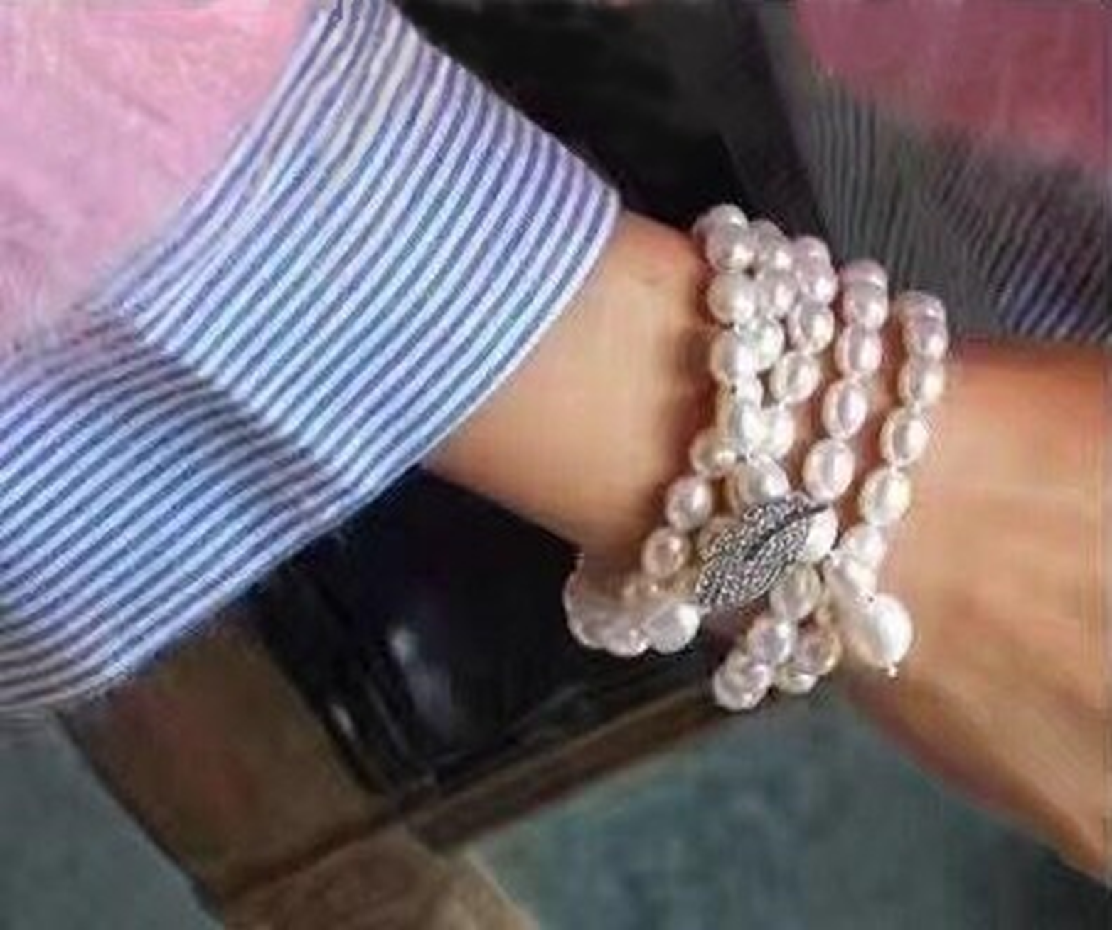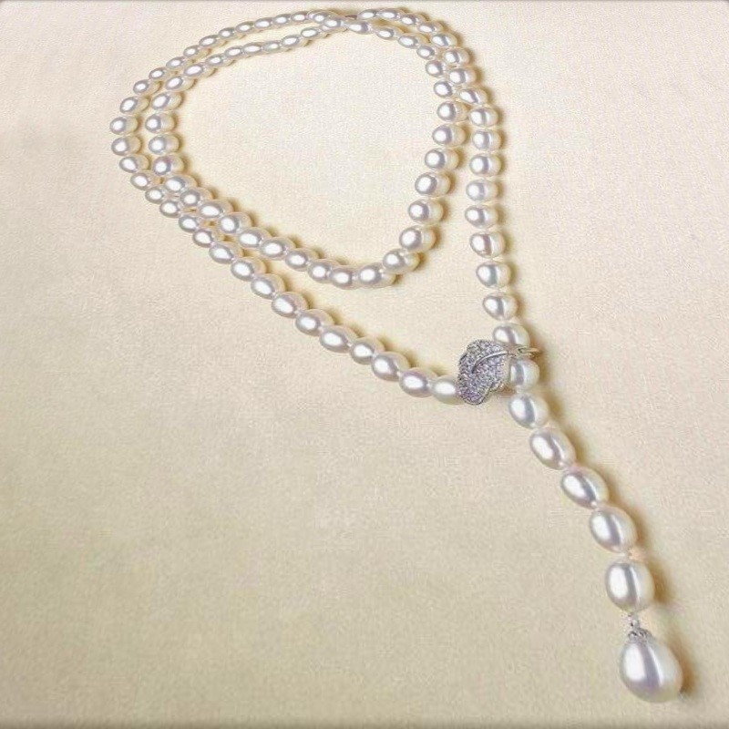 Perles véritables d'eau douce ovale 7-9 cm-Périmètre 91 cm-Attache en argent 925 pavée zirconium refflet diamant